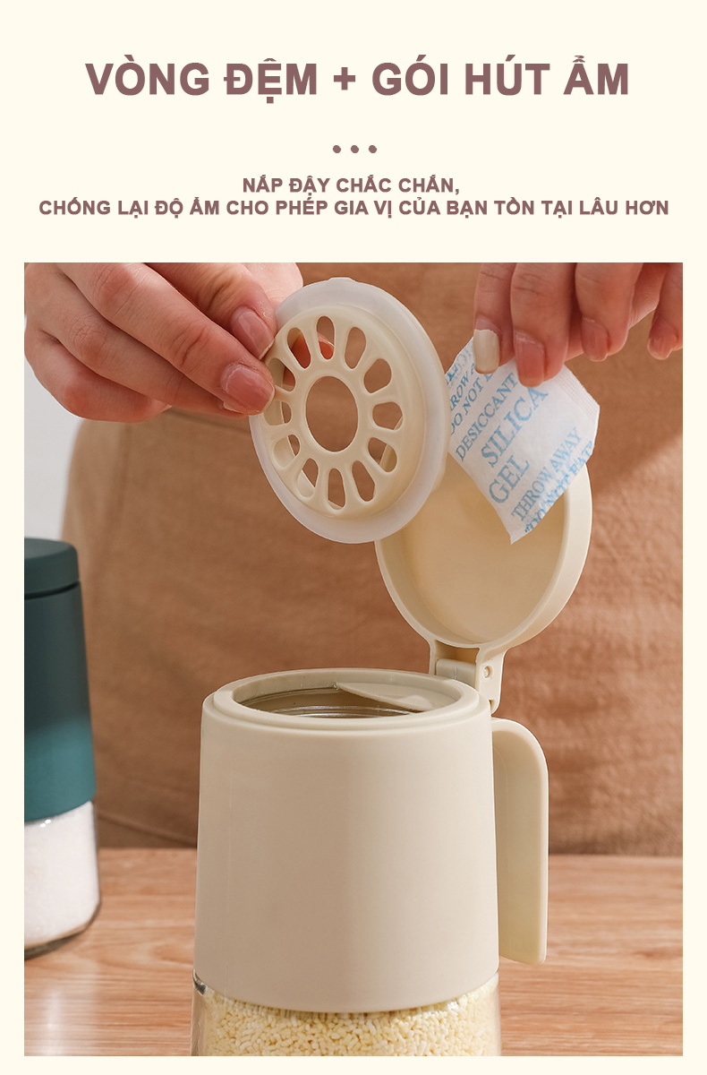 - Trên miệng nắp còn chứa miếng hút ẩm hai lớp, giữ cho gia vị luôn khô ráo