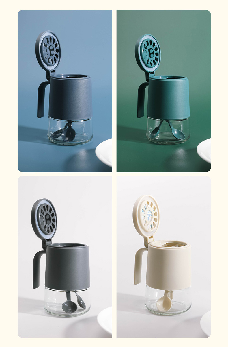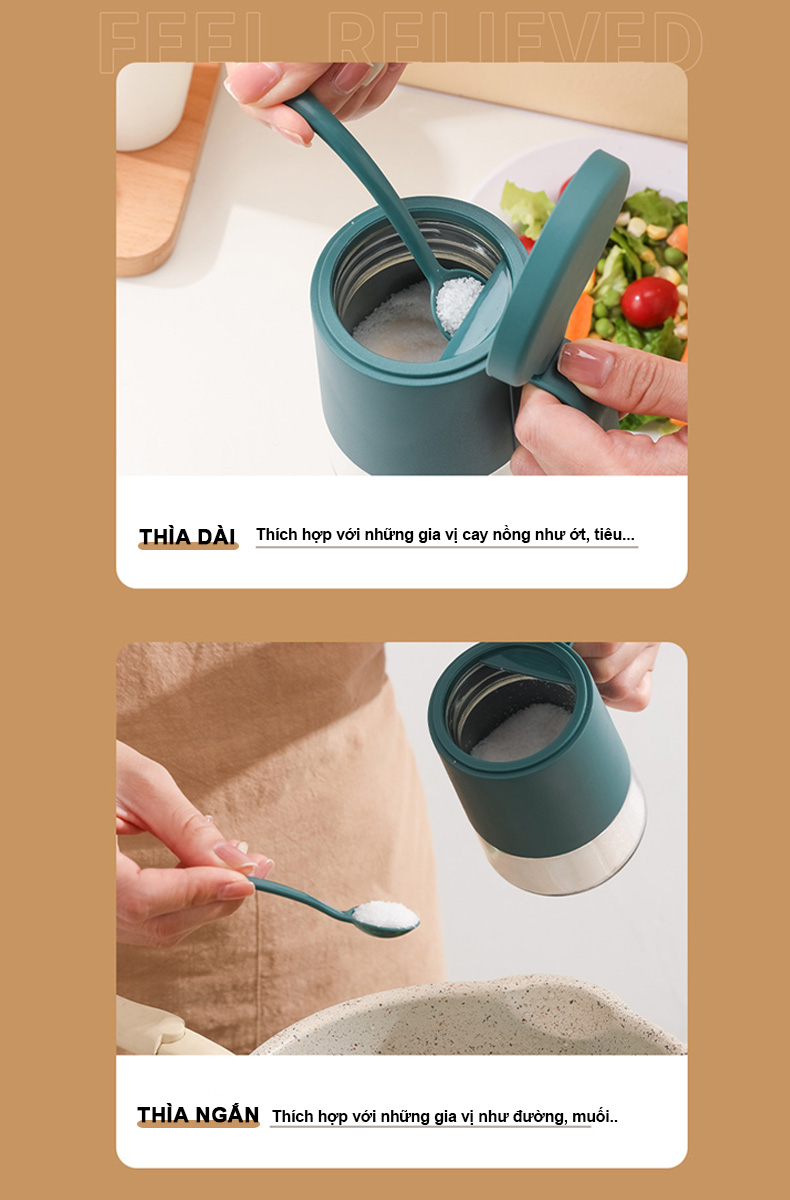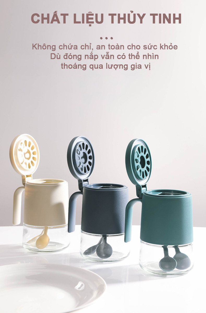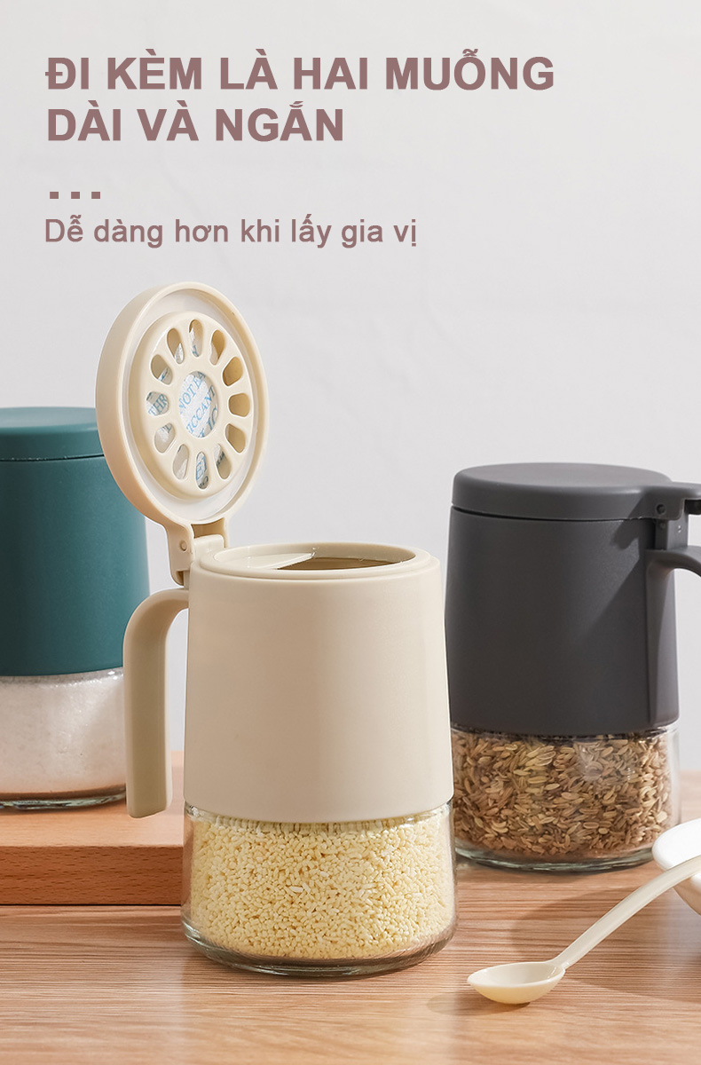 - Hủ đựng gia vị kèm sẵn muỗng, cho việc lấy gia vị dễ dàng hơn