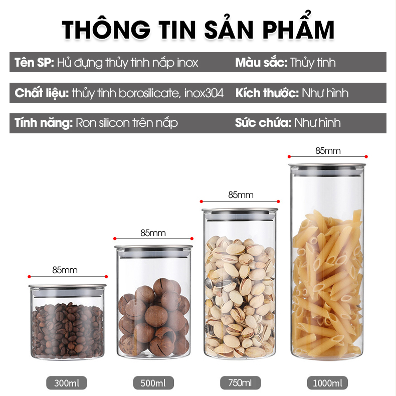 - Tên sản phẩm: Hủ đựng trà thủy tinh, hủ đựng ngủ cốc nhà bếp, đồ ăn nhẹ snack, hủ gia vị có nắp bằng INOX cao cấp MFG-006