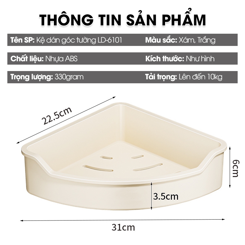 - Tên sản phẩm: Kệ góc tường treo nhà tắm nhà bêp LD-6101, nhựa ABS siêu cứng cáp và bền bỉ