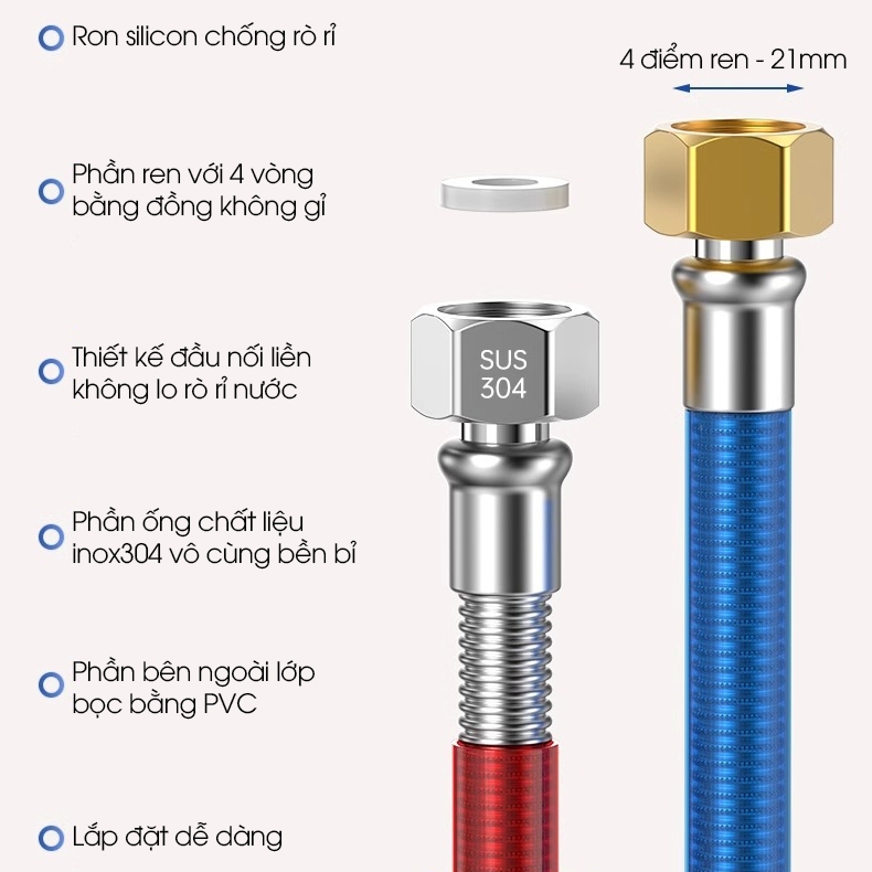 Ống dẫn nước nóng lạnh, ống nối cho bồn lavabo, bồn vệ sinh, máy giặt, máy nóng lạnh, inox 304 uốn cong tùy ý dễ luồng lách